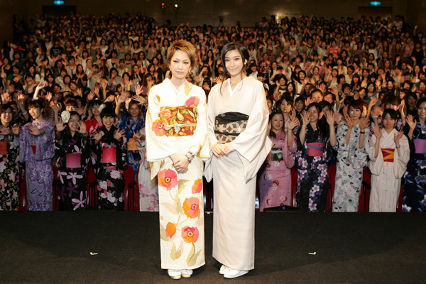 “女性が憧れる女性”の代表格である篠原涼子と中島美嘉。ハードボイルドヒロイン・雪平刑事を演じる篠原と、映画主題歌「LOVE IS ECSTASY」を歌う中島が、美しい和装に身を包み、浴衣着納めの女性客約500名の前に登場。
