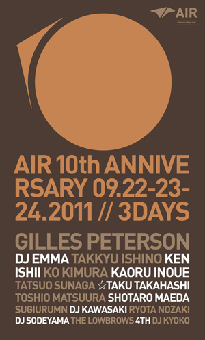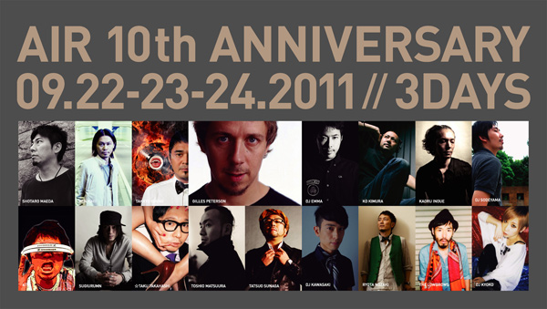 9月22日、23日、24日に、10周年を記念するAIR TOKYOがアニバーサリーイベントを開催する。石野卓球、☆タク・タカハシ(m-flo | TCY Recordings)、野崎良太(Jazztronik)、ケン・イシイ、4thといったそうそうたるメンバーに加え、海外からはジャイルス・ピーターソンをはじめとした豪華アーティストが登場、たっぷりとプレイが堪能できる濃厚な3日間だ。