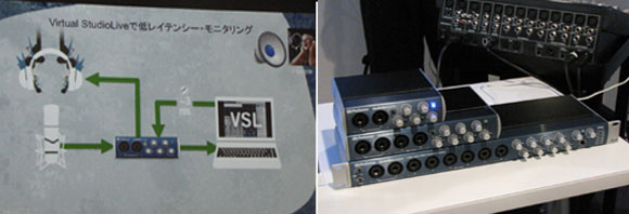 ▲VSLソフトウェアによる低レイテンシーでのリバーブ込みのモニタリングの概念図(写真左)。本体は幅は異なるが奥行きは同じ(写真右)。