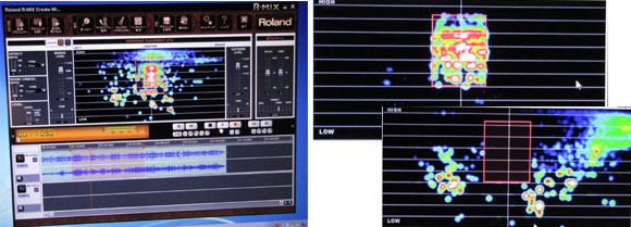 ▲R-MIXの画面。オーディオの音程や定位などをグラフィカルに表示。右上は指定部分のみを再生中、下は指定部分以外を再生中。しっかりとねらった音の消去・抜き出しができている。