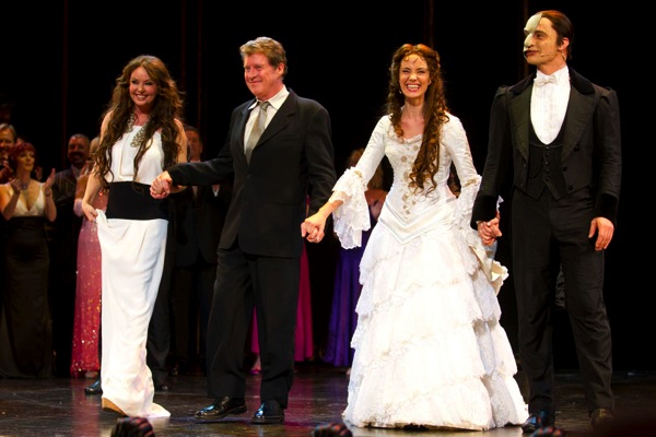 左より、サラ・ブライトマン(ロンドン初演のクリスティーヌ)、マイケル・クロフォード(ロンドン初演の怪人)、シエラ・ボーゲス(25周年記念公演のクリスティーヌ)、ラミーン・カリムルー(25周年記念公演の怪人