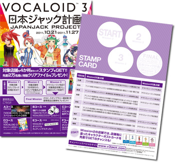 <VOCALOID3リリース記念イベント 日本ジャック計画>と名付けられたこのスタンプラリーは、各対応都市のBIG ECHO23店舗をはじめ、VOCALOID関連商品やサービスを取り扱う参加店舗で3つのスタンプをゲット、最後にヤマハ店舗で4つめのスタンプをコンプリートすることで、様々な商品がゲットできるというもの。