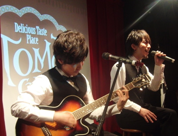 今週の+Plusはいつも出演させていただいている六本木のmorph-tokyoでのライブからスタート。メンバーのコニーが舞台稽古のため、一人欠けてのライブでしたが、僕らを知り尽くしているライブハウスのスタッフさんと温かいお客さんの力を借りて、楽しくライブすることができました!!そして翌々日はまた六本木で、今度はメンバーのトモが一日限定でプロデュースする「Tomo Cafe」でのイベントに参加させていただきました。店の飾りつけからフード&ドリンクメニュー、衣装から店内BGMの選曲など全てをメンバーのトモが考えて作られたスペシャルなカフェでした。ランチタイム、カフェタイム、ディナータイムの3部構成になっていて、それぞれの時間に僕とMOTOでミニライブをさせてもらいました。いつもと違う空間ということで、ライブもいつもと違うことをしようということで、まず二人だけでライブの時点でいつもと違うのですが…、お互いのパートを交換したり、アコースティックやカバーなど、好きなように楽しまさせてもらいました。そしてまさに今日これから+Plusとしての活動ではありませんが、いつも+Plusを支えてくれるサポートメンバーの3人が以前に組んでいたバンド「HAV」の一夜限りの復活ライブがあります!!メンバーのMOTOも一曲だけ飛び入り参加するようなので今から見に行ってきま~す。楽しみだ!!来週は舞台「戦国BASARA3」で毛利元就に扮して激闘中のリーダーコニーの見参です!! お楽しみ!