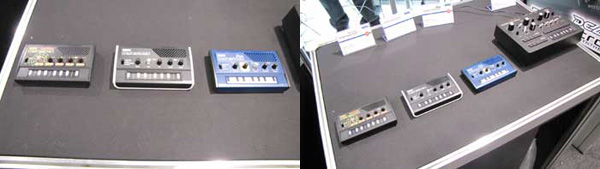 ▲monotron DELAY(左)とmonotron DUO(右)。サイズは初代モデル(中央)と同じ。右の写真の一番端のmonotribeと比較するとその小ささがわかる。これら4モデルは多くのデモ機が用意されており、ヘッドフォンで聴き比べも可能な状態。