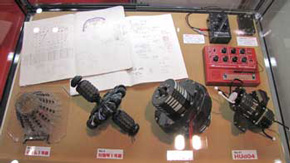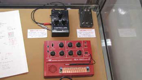 ▲SX-150MARKII用のMIDIインターフェースはUSB対応のものと合わせて2タイプ展示。その下が開発者によるスタイロフォンタイプのカーボンパネルに改造したモデル。