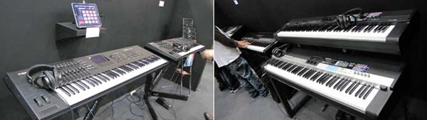 ▲(写真:左)シンセのMOTIFシリーズは、エディターソフトやコントローラーソフトをインストールしたiPadとともに展示。(写真:右)ステージピアノのCPシリーズやSシリーズもフルラインナップでスタンバイ。