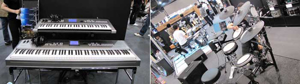 ▲(写真:左)エントリーモデルのMM6/MM8やMOXシリーズも人気のシンセサイザー。(写真:右)電子ドラムのDTXシリーズも多数用意。ドラマーがひっきりなしに訪れ撮影も一苦労。