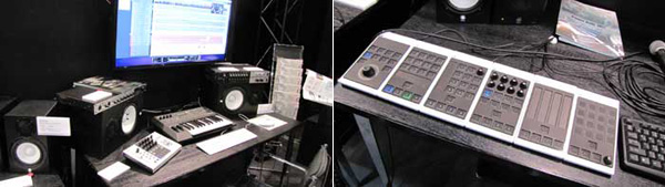 ▲(写真:左)スタインバーグのCubaseシリーズはオーディオインターフェイス、コントローラー、キーボードKXとともに展示。(写真:右)デザインも魅力のCubase用USBコントローラーの新製品CMCシリーズは6機種すべてがチェックできる状態。