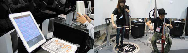 ▲(写真:左)テノリオンは、ハードウェア版の2機種とともにiPad版も展示。試奏の人気はハードウェア版。(写真:右)サイレントシリーズも試奏者の人気を集めているシリーズ。ブース内では随時ライブが見られる。