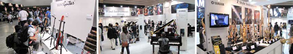 楽器フェア最大のスペースを誇るヤマハのブース。ギターやシンセ、ピアノ、ドラム、管弦楽器などジャンルの幅広さも髄一で、試奏者の数もかなりのもの。