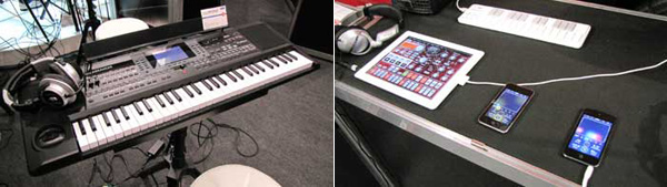 ▲(写真:左)作曲アシストキーボードmicroARRANGERはミニ61鍵で、304種類のバッキング用スタイルを内蔵。662音色+33ドラム・キット、89エフェクトを備える。11月下旬発売で52,500円。(写真:右)iPhone/iPad用アプリも触ることができる。右のiPhoneで動いているのが発売されたばかりのiKaossilator。