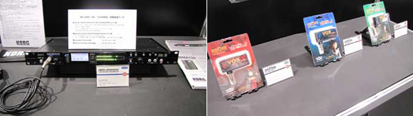 ▲(写真:左)ポータブルCDミュージック&ボイストレーナーCD-TV2をはじめとしたトレーナーも各種展示。(写真:右)アコースティック楽器用トレーナーのLR-10、ポータブルギター/ベースレコーダーGT-R1なども注目を集めた機種。