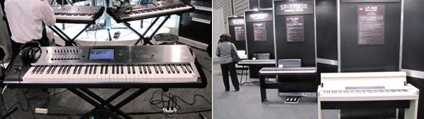 ▲(写真:左)9つの音源を搭載したワークステーションKRONOSはヘッドホンとともに試奏し放題で展示。(写真:右)電子ピアノの新製品LP-350のアイボリーモデル、LP-350IV、ペダルユニット付きとなったSP-170DXなども。