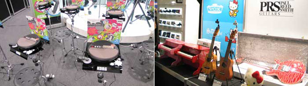 ▲(写真:左)ガジェット系楽器のパーカッションWAVEDRUM Miniのセミナーは席が埋まるほどの人気。(写真:右)VOX、RPSのハローキティとのコラボモデルのウクレレやギターには親子連れが集まっている。