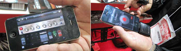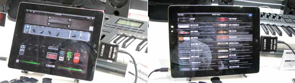 ▲(写真:左)iPadに接続されているのがオーディオインターフェイスのMobile In。iPad/iPhone版のPODソフトウェアでさまざまなギターサウンドが楽しめる。(写真:右)iPhone/iPad用PODはMobile In専用のアプリで、無償提供される。Mobile Inの発売と同時にリリース予定。β版とはいえ、あのPODサウンドがしっかり楽しめる出来だった。