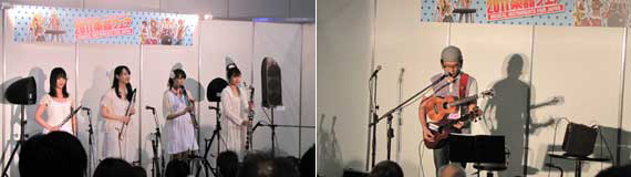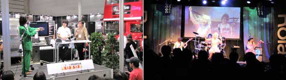▲(写真:左)コルグブース内で行われたmonomaniaサウンドコンテストの受賞作品発表。受賞者には豪華商品が提供された。(写真:右)ローランドブース内の特設ステージで行われたガールズバンドGacharicSpinのスペシャル・ライブ。最終日まで毎日開催。