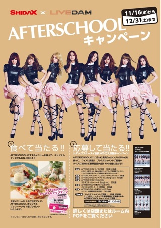 11月16日からスタートしている<SHIDAX × LIVE DAM AFTERSCHOOLキャンペーン>では、AFTERSCHOOLおすすめメニュー3品のうち1品を注文すると、オリジナルブックマークがプレゼントされるほか、セクシーと話題の11月23日にリリースされる2ndシングル「Diva」を歌ってクイズに応募すると、AFTERSCHOOLライブ招待や、11月26日にシダックス新宿セントラルロードクラブで行なわれるプレミアムイベント招待、さらに、AFTERSCHOOLサイン入りカレンダー(Diva ver.)などが抽選でプレゼントされる。応募締切は2011年12月31日(プレミアムイベント招待のみ11月20日締切)。