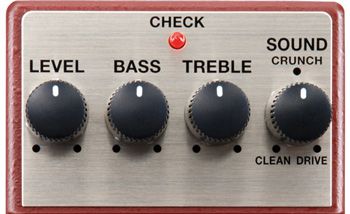 BC-2のボディは、AC30のスピーカーグリルを思い起こさせるような、赤っぽい茶色。そこに4つのつまみが並んでいる。左からLEVEL(レベル)、BASS(ベース)、TREBLE(トレブル)、そしてSOUND(サウンド)だ。一般的なエフェクターと同様に、LEVELでエフェクトがオンのときの音量、TREBLEとBASSで、それぞれ高域と低域の増減を設定することができる。そして特徴的なのがSOUNDつまみ。歪みの強さと音のキャラクターをコントロールするものだ。時計で言う7時くらいの位置にCLEAN、12時の位置にCRUNCH、そして5時の位置にDRIVEという表示があるが、左から右へとこのつまみを回していくと、最初は歪みのないクリーンな音で、そこから徐々に歪みが増し、クランチサウンドからドライブサウンドへと変化していくという仕組みなのだ。