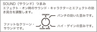 SOUNDつまみはゲインのような働きをするので、上げていくと徐々にレベルが上がり、歪みも増していく。そして9時くらいの位置からは一段と歪みが強くなるが、ここからがCRUNCHサウンドということになる。BC-2のCRUNCHサウンドは、いわゆる“クランチ・サウンド”の典型的な音。アタックはジャキッと明瞭、音圧があって抜けがいい。歪みは比較的粗めだが明るい音、サスティンもかなり伸びる。このCRUNCHでは、ギターのボリュームはもちろん、ピッキングのニュアンスにも反応して微妙に歪み方が変わるのも特徴だ。ギターのボリュームを絞ると、SOUNDつまみをCLEANにしたときと同じような音になるが、ボリュームを上げていくと徐々にアタックが鋭くなり抜けがよくなってくる。また弱めのピッキングでは歪みは軽く低音も出るが、強く弾けばアタックがより強く、ガツンと来る音になる。弾き方できちんとメリハリを出すことができるわけだ。逆にいえば、ピッキングのニュアンスが強調されることになるから、そこを意識して演奏する必要もありそうだ。