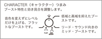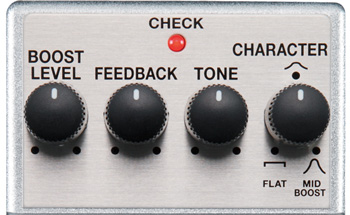 このようにブースターといっても使い方によって様々な役割があるのだが、FB-2はそういった複数の役割を1台で実現してしまう。その秘密はCHARACTER(キャラクター)つまみにある。このつまみをもっとも左、7時の位置にするとフラット特性、つまり音を変えないクリーン・ブーストになるのだが、右に回すにしたがって高域と低域が抑えられ、もっとも右まで回すと中域を強調したミッド・ブーストになる。