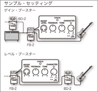 次はもっともよく使われるであろうパターン、FB-2の後ろにBC-2を置き、FB-2でブーストした音をBC-2に送るというつなぎ方で試してみた。BC-2のSOUNDつまみは11時くらい、軽く歪むCRUNCHサウンドに設定。そしてFB-2をオンにすると、歪みはかなり強くなる。BC-2のSOUNDつまみを90度ほど右に回したのと同じくらい歪みが足される印象。そして歪み方もBC-2単体のときよりきめ細かくなった。全体の音のキャラクターは、FB-2のCHARACTERの設定によって変わる。フラットから右に回していくと、徐々に低音が減ってスッキリした感じになり、さらにミッド・ブーストまで回すと音圧のあるドライブ・サウンドになる。このドライブ・サウンドは迫力があってカッコいい。単音のリフなどでもかなり存在感が出てくるだろう。また、この組み合わせの場合は、BOOST LEVELをうまく調整すれば、音量を変えずに歪みだけをプラスすることもできる。まさにアンプのチャンネル切り替えのように使えるわけだ。