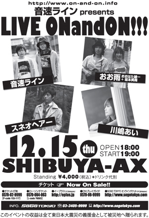 なお、12月15日(木)には、SHIBUYA-AXにて<音速ライン presents LIVE ONandON!!!>を主催、スネオヘアー、おお雨(おおはた雄一+坂本美雨)、川嶋あいとともにライブイベントを行なう予定となっている。また12月8日(木)には、当日ライブに出演する川嶋あいや坂本美雨とともにニコニコ生放送を行ない(http://live.nicovideo.jp/watch/lv72866443)、このLIVEの直前スペシャルとして対談やアコースティックライブが公開される。