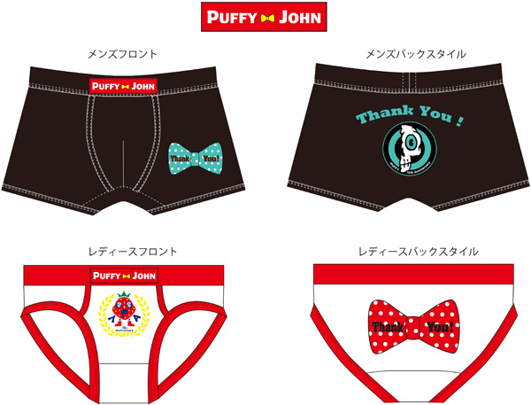 登場したのはメンズとレディースそれぞれに「女の操」「男の操」と名付けられ各2625円で発売となる。レディースパンツはブリーフタイプ、メンズはボクサータイプで、PUFFY15周年ロゴがあしらわれたデザインとなっている。PUFFYファンクラブ限定イベント<劇団アセス第1回「男子会」「女子会」>に際して作製されたレアアイテムだ。