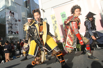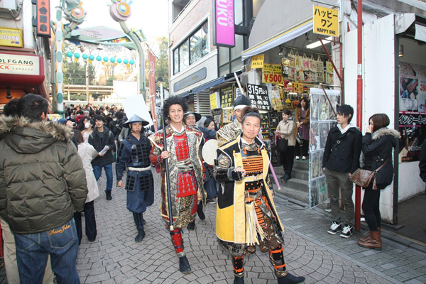 12月10日(土)、名古屋おもてなし武将隊から、豊臣秀吉・前田利家・前田慶次・市蔵・亀吉の5名が名古屋を飛び出し、若者の街・原宿に現れた。