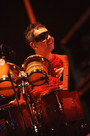 続いてのゲストは御大ドラマー、村上”PONTA”秀一。サンタクロースを彷彿させる赤いガウン姿で舞台に表れた。圧巻は「READY TO FLY」内でのパーカッション・斉藤ノヴ、80年代の高中正義バンドを支えたドラマー・宮崎まさひろと村上”PONTA”秀一のソロ・セッションだ。熟練プレイヤー3人の夢の競演だけでも凄いところに、高中正義のギターが唸るように絡むというフュージョン・ファンにとってのまさに至福の瞬間となった。