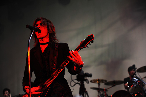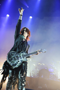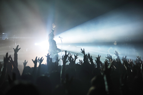 フロアから起こる歓声が、SUGIZOの弾く飛翔感あるフレーズに絡み、とてつもないパワーが会場に渦巻く。それを増強させるがごとく、ヘヴィ・リフも印象的なキリング・ジョークのカヴァー「EXORCISM」へ。激しく点滅するストロボ・ライトの中で、SUGIZOは弦を激しくピッキングしながら叫ぶように言葉を繰り出す。さらにステージ上手で腰を落としてギターをかき鳴らし、今度はステージ下手であおる。曲の中盤では何本ものスポットライトの光を浴びながら、ワウペダルを踏みながらギター・ソロを決める。ポジティヴなエネルギー全開のステージと、早くも興奮の頂点に達したオーディエンスだった。
