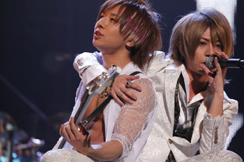 シンが「オレとお前たちとの大切な始まりの曲」と思いを込めたインディーズデビュー曲「Take-off」ではイントロではじけるような声が起こり、サビでは8000人が一斉にジャンプ。「BLUE」では「♪ゆらりゆらり」の歌詞に合わせるように客席がやわらかに揺れた。「Rem」「夏花」とゆったりとした曲が続いた中盤。空気を切り裂くようにKo-kiのドラムソロがスタート。赤、白、紫のスポットが光る中、約3分に渡り自らの限界に挑戦するかのようにドラムと向き合い聴衆を圧倒した。