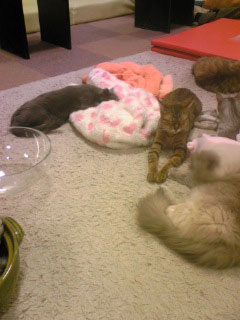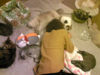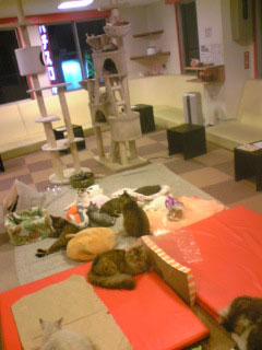 ごらんになって! 暖かい部屋に案内されると20匹くらいの猫が思い思いにくつろいでいるではありませんか。小躍りしながら猫のそばに寄ってみると