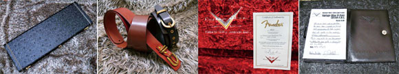 そして、今回製作されたモデルには、マスタービルトシリーズには担当のマスタービルダーからのスペシャル・メッセージカードと特製レザーバインダー、スペシャルデザイン認定書が付属。また、チームビルト製品にはカスタムショップにおいてのディレクター/マニュファクチュアリング・オペレーターのジェフ・ジュースト、マネージャーのマイク・エルドレッド、セールスのマイク・ギーガン各氏の直筆スペシャル・メッセージカードと特製レザーバインダー、スペシャルデザイン認定書が付属。そしてすべてのモデルに特注のDeluxe Black Tooled Western Hardshell Caseと山野楽器オリジナルレザーストラップが付属する。