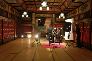 この「松本館 旧館」は、国の登録有形文化財に認定されている重要建造物。「鳳凰の間」は、地元の彫刻家・太田南海の手による床柱や、折上格天井、建具など各所に壮麗な内装を備えている優美な空間で、この中でアーティストの撮影が行なわれたのは初めてということで、地元新聞社からも取材があったという。