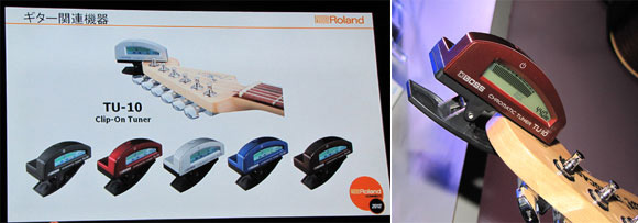 クリップ・オン・クロマチック・チューナーの「TU-10」は、全5色を揃えたチューナー。カラーLCDの搭載が特徴で、暗いライブステージでも視認性は抜群。電池の消耗を防ぐモノクロモードも備える。「画面がカラーになるだけでこんなに見やすくなると感動」「まわりで大きな音が鳴ってるなかでもしっかり反応してくれるのはありがたい」「動きまわってもずれない、落ちない」とは前出の安達久美。発売は4月予定。