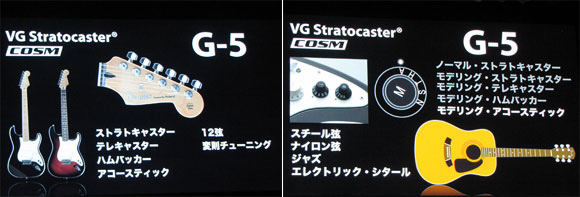 ▲1曲中で瞬時に設定を切り替え次々に多彩なサウンドが繰り出されたG-5のデモ演奏。G-5のヘッドにはTU-10が。G-5、GC-1ともに2色をラインナップする。