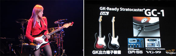 一方の「GK-Ready Stratocaster(R) GC-1」は、Stratocaster(R)にディバイデッドピックアップを内蔵、GK出力端子からGKケーブルを1本接続するだけで、V-Guitarシステム「VG-99」、ギターシンセサイザー「GR-55」をコントロールすることができるモデル。メイプル指板のブラック(4月下旬発売)とローズウッド指板のサンバースト(3月下旬発売)の2モデルがラインナップされる。