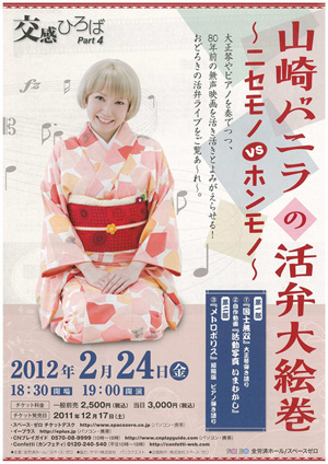 2012年2月24日、全労済ホール/スペース・ゼロで行われた<活弁大絵巻~ニセモノvsホンモノ~交感ひろば>。山崎バニラの独特な声で語られる言葉は、故き映画を今に蘇させる魔法のようだった。