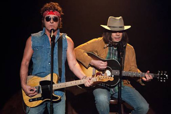 番組では連日ブルースを取り上げていたのだが、特集最終日、司会者のジミーが70年代風ニール・ヤングのモノマネで1曲歌い始め、そこにブルース本人が赤バンダナ&上下デニム&サングラスというファッションで登場、一緒に歌うというサプライズが起こった。ブルースのこの姿は、1980年代『ボーン・イン・ザ・U.S.A.』時代という時代外れな格好をパロッた自虐ネタでもあり、しかもふたりはLMFAOの「セクシー・アンド・ユー・ノウ・イット」をフォーク調で熱唱するという始末。決めフレーズの「ウィグル・ウィグル・ウィグル…!」も連発する徹底ぶりだ。