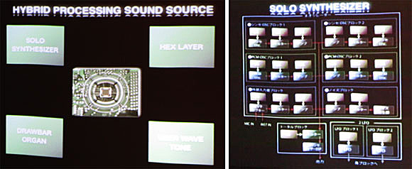 ▲新開発のサウンドエンジンは、音源LSI、高性能CPU、新規デザインのDSPなどを融合した「HYBRID PROCESSING SOUND SOURCE」(写真左)。「SOLO SYNTHSIZER」は6つのブロックからなるオシレーターと2つのLFOブロック、トータルブロックで形成。オシレーターは、シンセが2系統、PCMが2系統。外部入力とノイズも独立したブロックとして装備される(写真右)。