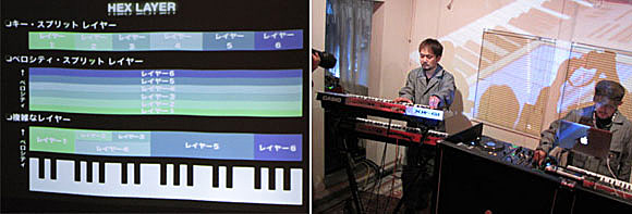 ▲「HEX LAYER」は最大で6つのPCM音源をレイヤーすることができるもの。それぞれのレイヤーは詳細にエディット可能。キースプリット、ベロシティスプリットなども柔軟に対応(写真左)。別室では守尾崇氏、伊藤陽一郎氏によるDJセットを交えたプレイも披露(写真右)。