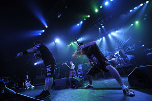 「小さな君の手」のミュージック・ビデオがスクリーンで流れた後、ライヴは「maximum the hormone」で始まり、ホルモン側の仕掛けで白鳥の着ぐるみでヘドバン、フライング・シューズ(ドクター中松考案のピョンピョン飛べる靴)やアクティヴ・スウィング(健康器具)でマス内で暴れる観客もあり、場内には奇妙なカオスが渦巻くという、予想通りの展開に。途中で“トラップ発動”がスクリーンで告知されると、「恋のスウィート糞メリケン」のナヲ・パートを選ばれし観客が歌うなど、お楽しみ要素も満載だった。