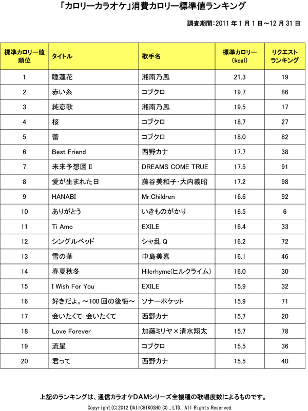 カラオケでダイエット、カロリー消費TOP20ソング発表