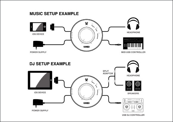 「V-MIDI」のセットアップはとても簡単で、iPhone、iPad、iPod touchとUSB MIDI機器を「V-MIDI」につなげて電源を入れるだけですぐに使える。今までできなかった、ドラムパッド、シンセサイザー、DJコントローラーでCoreMIDI対応アプリの音源をプレイすることが可能となる。
