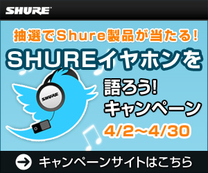 これは文字通り、TwitterでツイートするだけでShureの製品がもらえるという、簡単うれしいキャンペーンだ。シュア・ジャパンの公式アカウント@ShureJapan (http://twitter.com/ShureJapan)をフォローし、毎週出されるお題に沿ってツイートすればいいだけ。毎週抽選で1名にShureオリジナルグッズが当たる他、4週間のうちにツイートした人の中から抽選で1名に好きなShureイヤホンまたはヘッドホンをプレゼントするという。