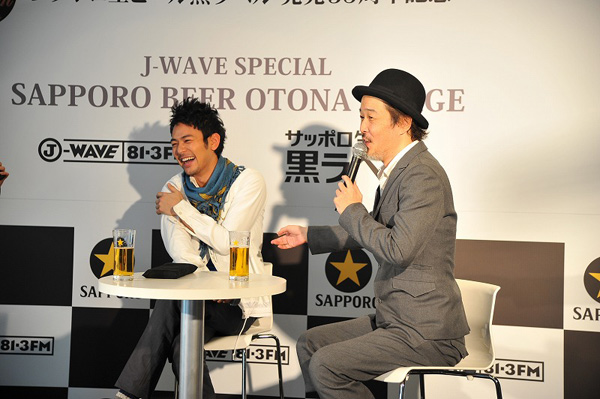 J-WAVEによるこのイベントは、サッポロ生ビール 黒ラベル35周年のバースデーである4月1日に開催となったもので、黒ラベルのテレビCMに出演中の妻夫木聡を迎えリリー・フランキーとともに、“大人”をテーマにしたトークを繰り広げた。