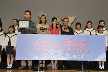 長編アニメーション映画『ももへの手紙』の公開を目前に、ボイスキャストと監督による完成披露試写会が実施され、主題歌を担当した原由子からのビデオメッセージが公開された。舞台では杉並児童合唱団とキャスト陣によって主題歌「ウルワシマホロバ~美しき場所~」も合唱され、温かい空気に包まれた。