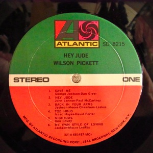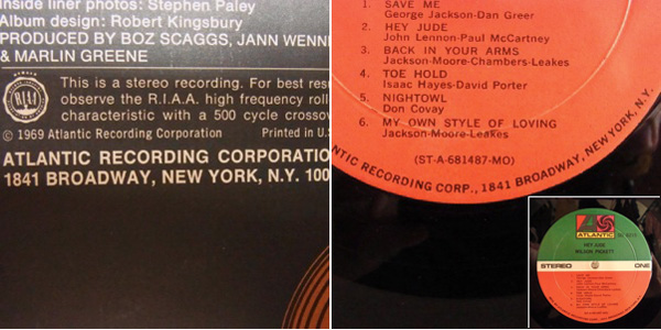 参考までに、『Boz Scaggs』と同じ1969年にアトランティックからリリースされたウィルソン・ピケットの『Hey Jude』のUSオリジナル盤を見てみましょう【写真(3)】。デザインは同じ、赤/緑レーベルですが、リムに「1841 BROADWAY ~」と記載があります【写真(4)】。1969年にアトランティックから発売されたレコードのオリジナル盤には、レコードレーベルのリムにこの表記があるはず、ということです。