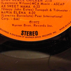 僕が最初に買ったこのレーベルには、そのリム表記の最後の「Made in U.S.A.」の前に、アルファベットの「w」をモチーフにしたロゴ・マークが入っています【写真(6)】。これはリプリーズの親会社であるワーナー・ブラザーズ(WARNER Bros.)のロゴ・マークで、1975年頃からリムの所在表記に入るようになりました(さらに年代によって住所の表記が変わります)。したがってこのレコードレーベルは1975年以降のプレス。『BOOMER’S STORY』のオリジナルリリースは1972年なので、僕がオリジナル盤だと思い込んで買ったこのレコードは、実はUS再発盤ということになります。