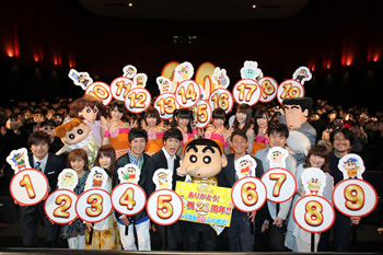 雨の日にも関わらず、舞台挨拶には多くのしんちゃんファン、家族連れが集まり、しんちゃんマスクを付けて20周年の『映画クレヨンしんちゃん』をお祝いした。しんちゃんが舞台上に出てくると、客席からは「しんちゃ~ん」「おめでと~」等と歓声が上がり、場内が祝福ムード一色に。